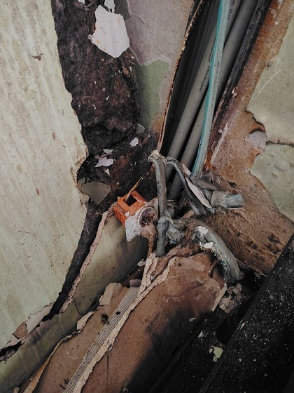 - całkowicie spaloną instalację elektryczną – konieczne wykonanie nowej od podstaw,