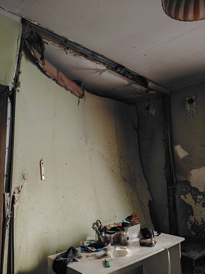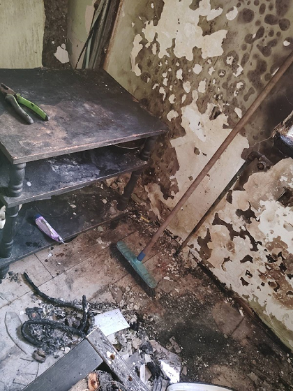 - całkowicie zniszczoną część domu, w której przebywał ojciec – stopiona lodówka, spalone meble i sprzęty, popękane ściany,